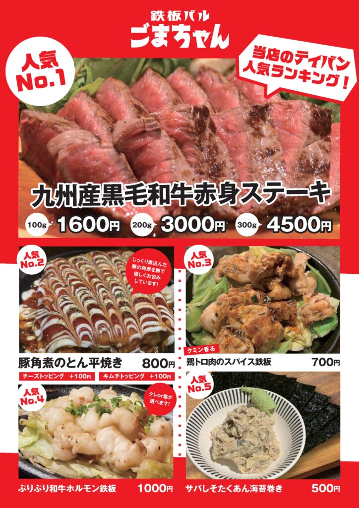 鮮度重視の九州産黒毛和牛を使用したステーキがド定番。レアで焼かれた旨味豊かな肉を豪快に盛り付けた逸品。