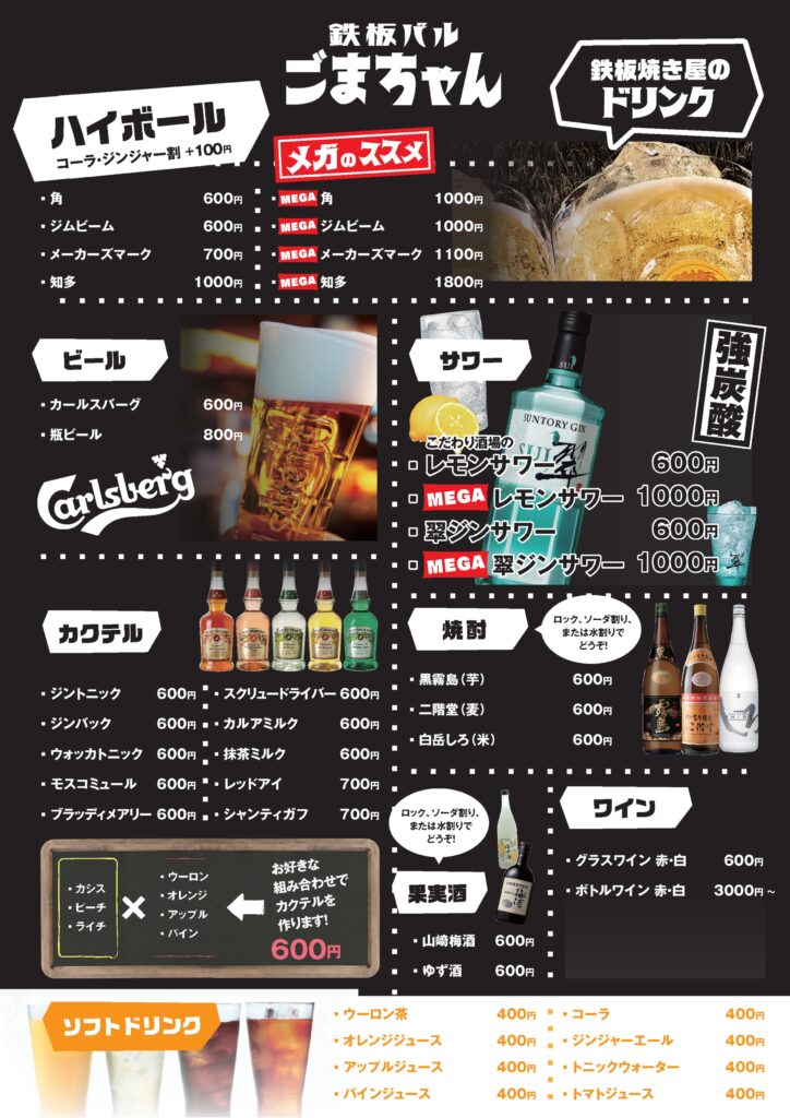 定番からその日限定のテッパンメニューに合うドリンクは、強炭酸のハイボール!2倍容量の「メガ」がお得。